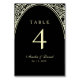 Elegante, chic, vintage número da mesa preta de casamento com espirais florais de ouro e roteiro de caligrafia moderno.