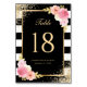 Cartão de número floral de mesa de casamento elegante, preto e dourado, com confete de ouro, flores cor-de-rosa-pincel, cor-de-rosa-pincel e flores de marfim, enfeitando uma armação de ouro contra um fundo listrado preto e branco. Itens correspondentes disponíveis.