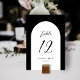 Estes cartões de números simples e na moda de mesa de casamento apresentam uma forma de arco em branco sobre um fundo de cor personalizado (mostrado em preto). Fácil de personalizar para o seu casamento ou outra ocasião especial.