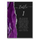 A borda esquerda desta elegante e moderna placa de número da mesa de casamento apresenta uma cor d'água roxa, borda agitada com falso brilho prateado. A palavra "mesa" aparece em um guião de escrita manual de cinzas prateadas sobre fundo preto. Adicione os nomes dos seus convidados que estão atribuídos a cada mesa.