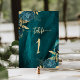 Este cartão elegante de número de mesa de casamento apresenta ramos florais azuis-turquesa realçados com folhagens douradas em folha falsa em dois cantos, sobre uma imagem de fundo de ágata em aquarela turquesa. O texto personalizável apresenta a palavra "mesa" e um número de mesa editável em fonte manuscrita dourada.