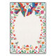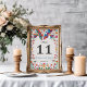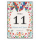 Esta design vibrante da Mesa Numérica Floral Moderna Boda, Colorida pela Fiesta Mexicana, apresenta dois pássaros coloridos com asas estendidas no topo, cercando um coração vermelho, simbolizando amor e unidade. As bordas florais circundantes são adornadas com folhas verdes vivas e flores multicoloridas, enquanto corações e pétalas menores adicionam um toque brilhante e romântico. A composição geral cria uma atmosfera alegre e festiva, ideal para celebrar um evento especial como um casamento.