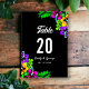 Estes elegantes números de mesas tropicais são perfeitos para um casamento de verão moderno. O simples design apresenta flores amarelas, roxas e cor-de-rosa floridas com tipografia branca elegante sobre fundo preto em negrito.