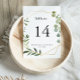 Este número da mesa de casamento da caligrafia verde-tropical de ouro geométrico é perfeito para um casamento moderno. A design apresenta lindas folhas verdes pintadas à mão, enfeitando um quadro geométrico dourado. Este é um número de tabela de dois lados. Adicione cada número de tabela de que você precisa ao seu carrinho individualmente.