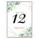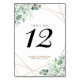 Número da Tabela Geométrica de Casamento Eucalyptus Dourada em Verde Moderno. Possui folhas de cor aquática de eucalipto e estrutura geométrica dourada.