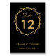 Em torno do número, ele tem uma moldura irregular em ouro feita a partir de dois hexágonos de ouro que se sobrepõem a um fundo preto. O título "Mesa" e os nomes da noiva e do noivo são escritos em uma fonte caligráfica elegante. Todo o texto tem uma cor amarela dourada, como a moldura de ouro.