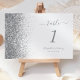 A borda esquerda deste número de mesa de casamento moderno e elegante apresenta um design de brilho falso prateado. O texto personalizável combina fontes manuscritas cinzas, copperplate e itálicas em um fundo branco.