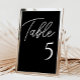 Números modernos da mesa elevam a decoração da mesa da recepção de casamento. O design apresenta uma fonte elegante em branco sobre um fundo preto perfeito para um casamento elegante ou evento banquete. Solicite cada número de tabela da coleção ou edite este cartão para cada número necessário. A design é impressa em ambos os lados.