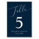 Número mínimo e elegante da mesa de casamento com texto moderno de roteiro que diz "Mesa" no topo de um fundo azul marinho.
