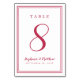 Um modelo para qualquer número, esse design de número de mesa de casamento simples, minimalista e elegante apresenta um design contemporâneo com uma borda de quadro duplo em vermelho magenta na moda sobre um fundo branco crocante. O design sofisticado fornece sofisticação moderna e atemporal. Personalize o design da mesa de casamento com seu nome, data de casamento e número da mesa em letras e caligrafia da moda. O verso do cartão é uma duplicata da frente. Personalize facilmente e encomende um para cada mesa com os números de mesa individuais.