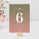 Números de Tabela de Janto de Recepções de casamento Monogramadas, cor-de-rosa verde e poeirento. Esta moderna placa de Mesa chic é simples, clássica e elegante, com um sutil desvanecimento do gradiente ombre e uma bonito letra de escrita de assinatura com caudas. Mostrada na nova estrada. Disponível em várias opções de cor ou não se sinta à vontade para editar as cores no editor (clique em personalizar mais enquanto personalizar). Para ver mais, procure as coleções de casamento de 2022 da Chic Paperie para ver todas as tendências de designs e cores de casamento para este ano.