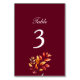 Adicione um toque na moda sazonal à sua recepção com este cartão de número da tabela de casamentos outono. Apresentando um fundo rico e burguês e folhas vibrantes do outono de aquarela, este design é perfeito para casamentos rústicos ou elegantes em setembro, outubro ou novembro. Numeração a negrito e tipografia clássica tornam a cadeira fácil e bonita.