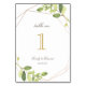 Cartões de números de mesas de casamento personalizados, com uma estrutura de ouro geométrica na moda moderna e design de verde-aquarela. Personalize com os nomes da noiva e do noivo e a data do casamento. Perfeito para casamentos de jardim. *Personalize e adicione cada placa ao seu carrinho de compro separadamente.*
