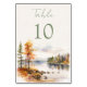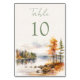 Coloque o tom para sua casamento outono com este número romântico de mesa de casamento, apresentando um lago sereno e uma cena de montanha em camadas sobre impressão de linho rústico. Perfeito para um casamento confortável ao ar livre, elopeios de outono ou casamentos de destino pela água. Personalizável com seus nomes, datas e local - parte de nossa Coleção de Casamentos outono de um pacote de artigos de papelaria coordenado.