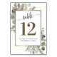 Torne sua recepção de casamento bonita com estas cartas de números de tabela. Eles apresentam um belo design com uma caligrafia antiga rodeada por um monte de folhas de eucalipto e galhos de pinheiro em tons de verde-sábio e ouro. Há espaço para os nomes do casal e da data do casamento, bem como para o número da tabela.