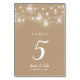 Cartões de números de tabela de casamento impressos com um modelo DIY simples para personalização. Este design de chic rústico apresenta cadeias de luzes brilhantes de cordas e frascos de pedras em um fundo falso de papel kraft. Personalize cada número de tabela de que você precisa e adicione cada um ao seu carrinho individualmente (nota: adicionar um número maior de placas ao carrinho resultará na impressão com o mesmo número). Use as ferramentas de design para escolher as fontes e cores de que você quiser ou carregar suas próprias fotos para fazer um design para seu decoro de mesa de casamento!