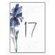 O número da tabela representa um design floral de cor aquosa moderna, com uma simples flor azul íris, verde e aspergido com pó prateado. Boa escolha para primavera e verão.
