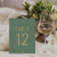 Elegante verde clássico e modelo de mesa de casamento minimalista de ouro. Isso apresenta um único e moderno ouro e sábio esmerald verde, design de uma folha de eucalipto. E o número da mesa amarelo-dourado sobre um fundo verde rico sábio. Pegue este moderno número da mesa de casamento da caligrafia branca e personalize-o.