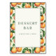 This wedding tabletop sign features a charming design with a central white square bordered by vibrant apricot illustrations and lush green leaves, creating an inviting and cheerful atmosphere. The color palette includes warm oranges and deep greens, enhancing the fresh and organic feel of the botanical theme. Elegant serif typography announces "DESSERT BAR" while playful sans-serif text encourages guests to indulge with "PLEASE TAKE A TREAT!" The overall layout is balanced and visually appealing, making it perfect for adding a touch of whimsy and warmth to any dessert station at your special event.