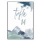 Tubarões secos modernos varrendo a página em azul empoeirado, azul pálido e verde-sábio. A caligrafia de pincelada soletra "mesa" com o número em uma fonte com estilo de pincel. O mesmo em ambos os lados. Design criado para o BarefootBride™ por © WhimsicalArtwork™ Personalize texto, estilo de letra, cor e tamanho. Criamos esta modelo para facilitar a personalização com suas próprias informações. Esta é parte do nosso Pacote de Papelaria Dusty Blue Foliage, Peonies de Marfim, com casamento, chá de fraldas e outros artigos de papelaria.