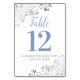Estes bonitos cartões de números da mesa de casamento apresentam um design simples, mas elegante, com a caligrafia de cinza azul-claro em um fundo branco com um filigre floral de folha de papel prateado nos cantos. Maneira perfeita de tornar sua recepção de casamento bonita e ajudar seus convidados a encontrar a mesa certa ao mesmo tempo.