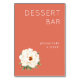 This is a minimalist style image with a warm coral background, featuring elegant white text that reads "DESSERT BAR" and an inviting message below it saying "please take a treat!" A delicate illustration of a cream-colored flower with green leaves adds a touch of natural beauty. The overall mood is welcoming and charming, perfect for adding a sweet touch to any event or gathering.