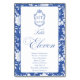Delft blue floral table number card, designed in a refined blend of chinoiserie and French toile de Jouy style. The soft botanical illustrations frame an arched layout featuring an elegant wedding crest monogram, perfect for couples who love vintage, historic, and European-inspired aesthetics. Classic script typography pairs beautifully with the ceramic-blue palette, making this design an effortless nod to the tradition of “something blue.” Fully customizable with your guest's names, wedding crest and in this design table number: Eleven, it’s an exquisite choice for any romantic or sophisticated wedding theme.