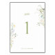 The table number card showcases a delicate floral border design, in a harmonious blend of soft pastel hues, including gentle pinks, blues, and greens. This soothing color scheme evokes tranquility and sophistication, beautifully complementing the clean and uncluttered layout of the wording.