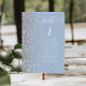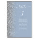 A borda esquerda desta elegante e moderna placa de número da mesa de casamento apresenta uma borda cintilante de falso prateado. A palavra "mesa" aparece em um guião branco e branco de escrita manual sobre um fundo azul empoeirado. Adicione os nomes dos seus convidados que estão atribuídos a cada mesa.