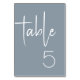 Números modernos da mesa elevam a decoração da mesa da recepção de casamento. O design apresenta uma fonte elegante em branco sobre um fundo azul empoeirado perfeito para um evento de casamento outono ou banquete. Solicite cada número de tabela da coleção ou edite este cartão para cada número necessário. A design é impressa em ambos os lados.