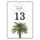 Um cartão de número de mesa de casamento inspirado na praia com uma imagem de aquarela de uma única palmeira costeira.