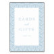 This elegant wedding tabletop sign features a classic rectangular layout with a central white space surrounded by a light blue damask pattern, creating a sophisticated and timeless look. The design includes the phrases "Cards and Gifts" in a mix of serif and script fonts, followed by "Thank You," conveying gratitude in a refined manner. The soft color palette and intricate floral motifs evoke a sense of calmness and appreciation, making it perfect for formal occasions. Its straightforward yet polished appearance ensures it complements any wedding decor beautifully.