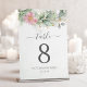 Lindos números de mesas de casamento com cor-de-água floral rosa eucalipto e folhas de ouro.