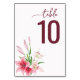 Este cartão de mesa de casamento elegante apresenta um design minimalista com um fundo branco limpo, criando uma sensação arejada e sofisticada. O número "10" é exibido de forma proeminente em uma fonte serifada marrom em negrito, complementada pela palavra "mesa" escrita em uma fonte cursiva correspondente acima dele. Uma delicada ilustração em aquarela de lírios rosa com folhas verdes adiciona um toque de beleza natural ao canto inferior esquerdo, realçando o charme geral. A mistura harmoniosa de tipografia moderna e elementos botânicos tradicionais torna este cartão perfeito para adicionar um toque refinado ao seu casamento.