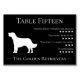 Uma mesa engraçada e única ou número de equipe. Perfeito para amantes de animais de estimação e cães, este número de tabela monocromática preto e branco é um de um conjunto de múltiplas raças de cães. A placa lê o número da tabela, seguido por Os recuperadores do Ouro e uma imagem de destaque branca de um recuperador. Como piada sobre as personalidades dos convidados, quatro traços de cães são listados, incluindo amizade para com estranhos, potencial de baba, tendência ao latido e uividade e brincadeira, ao lado de uma classificação de cinco estrelas. O cartão de mesa é adequado para um casamento, festa, teste ou qualquer outro evento que exija uma equipe, mesa ou plano de assentos.