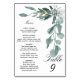 O design apresenta uma ramificação elegante de eucalipto que agrupa o número da tabela e o menu.