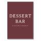 This elegant tabletop sign features a minimalist design with a rich maroon background and clean, classic typography. The text "DESSERT BAR" is prominently displayed in an inviting font, followed by the friendly phrase "PLEASE HELP YOURSELF!" which adds a warm and welcoming tone to any event. Perfect for weddings or gatherings, this sign exudes sophistication while encouraging guests to indulge in sweet treats. Its simple yet stylish presentation ensures it complements various decor themes effortlessly.
