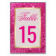 Cartões de número de mesa elegantes com uma borda falsa dourada e um belo fundo de glitter rosa falso.