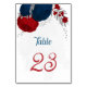 Vermelho escuro romântico e flores azuis marinhos com folhas prateadas cartão de número da mesa de casamento botânica. Os detalhes de brilho são simulados.