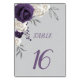 cartão de número de mesa botânica de flores roxas e brancas empoeiradas. Os detalhes prateados cintilantes são simulados.