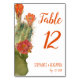 Números da mesa de casamento com cacto aquarela com flores vermelhas à esquerda e texto laranja-vermelho à direita. A palavra Mesa é escrita em uma fonte fancy, o resto em letras manuscritas.