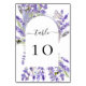 Um fundo branco elegante decorado com uma moldura em arco de flores roxas e lavanda. Personalize e os números da sua mesa. Letras pretas.