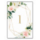 Número da Mesa de Flores Geométricas de Água-marinha da Primavera | Número de mesa elegante e feminino com ilustrações de água-marinha de rosas e peônias brancas, pêssegos e rosas, acentos de folhagens e moldura geométrica de folha falsa. Este número de mesa floral é perfeito para eventos de primavera e jardim.