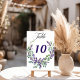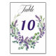 Um fundo branco na moda, decorado com violeta, flores de lavanda e verde de eucalipto. Personalize e seus números de tabela. Letras pretas e roxas.