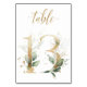 Lindo cartão de número de mesa com um motivo botânico - uma ilustração em aquarela de folhas verdes e douradas. Mesa 13. Por favor, verifique todos os números disponíveis