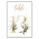 Lindo cartão de número de mesa com um motivo botânico - uma ilustração em aquarela de folhas verdes e douradas. Mesa 13. Por favor, verifique todos os números disponíveis