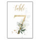 Linda cartão de número de mesa com um motivo botânico - uma ilustração de aquarela de folhas verdes e douradas. Mesa 7. Por favor, verifique todos os números disponíveis