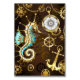 Fundo de madeira castanho com fundo marinho, cordilheira mecânica, volante antigo, âncora de ouro e diversas engrenagens de ouro e latão. Estilo Steampunk.