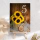 Adicione um toque de charme à sua festa casual do tema rancho do chá de panela ou recepção de casamentos com os bonito Sunflower e Garden Watering Can Wedding Table Number. Estas placas de números de tabela chic rústicas apresentam uma fotografia floral, quase aperfeiçoada digitalmente, de um buquê de flores de girassol amarelas em uma lata de água de prata, véu branco, lenço vintage aparado lenço de linho e fatia de madeira natural com a palavra LOVE queimado com uma toca e madeira de cascata marrom.