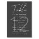 Esta placa de número de tabela de assentos de casamento chic e moderna apresenta um fundo de cinza escura com letras de script em branco. Personalize-o para as suas necessidades. Você pode encontrar produtos correspondentes na minha loja.